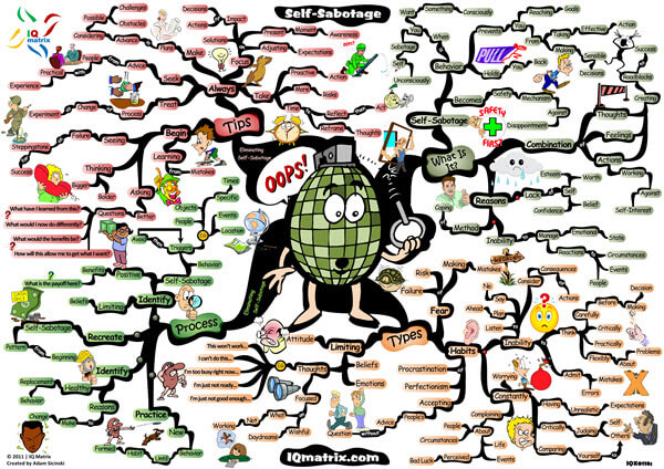 This IQ Matrix explores how we tend to sabotage our progress and efforts along our journey toward the attainment of our goals. The mind map outlines the primary reasons why we sabotage ourselves. It delves into the different types of self-sabotage patterns we tend to indulge in. These self-sabotage forces include fears, habits, limiting beliefs, a poor attitude, and unresourceful emotions. The map also explores a four-step process for overcoming self-sabotage patterns, and provides additional suggestions and guidelines for overcoming self-sabotage. Working through this map will help you take control of the self-limiting patterns of behavior that are holding you back from achieving your goals.
