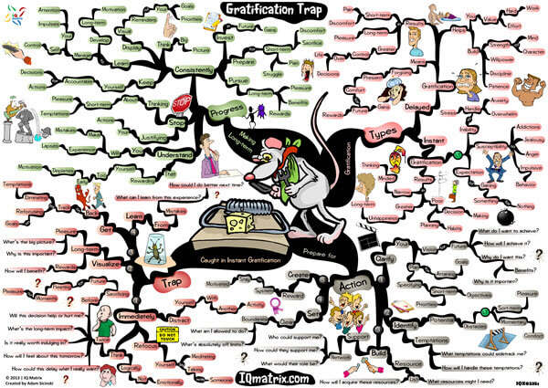 This IQ Matrix explores how to overcome the temporary pleasures and temptations that rob us of the opportunity to achieve our goals. The instant gratification trap is subtle. It creeps up on us when we least expect it, and then immediately pulls us away from the things that matter most. The more we indulge in these temptations, the deeper we’re drawn into fleeting small pleasures that feel incredibly satisfying, but ultimately lead to long-term pain. When we get caught up in this trap we sacrifice our future for fleeting moments of pleasure. Every small and seemingly insignificant decision builds upon the next, and before you know it, you’ve wasted your life away. With no self-control, you lose touch with what matters in your life. You lose touch with your priorities and live the rest of your life full of regrets. However, things don’t have to be this way. The mind map breaks down two types of gratification. It explores a five-step process to help you avoid getting caught up in instant gratification. It walks you through a four-step process to help you escape the instant gratification trap. And outlines how to avoid succumbing to instant gratification for long enough to achieve your goals.