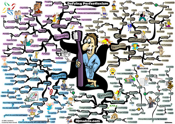 This IQ Matrix explores various ways to help you overcome the constricting consequences of indulging in the habit of perfectionism. Perfectionism is a very covert way we tend to sabotage ourselves. While indulging in perfectionism we feel as though we're making progress, however, it's ultimately nothing more than a smokescreen for our self-sabotaging behavior. The mind map identifies the disadvantages of indulging in perfectionism. It highlights the typical behaviors that lead to perfectionism. It outlines how we tend to hold onto our perfectionistic behavior and how it evolves over time. The map then presents you with several strategies and guidelines to help you overcome perfectionism in your day to day undertakings. Working through this mind map will help you develop the necessary traits, mindset, and behaviors required for overcoming your perfectionistic nature.