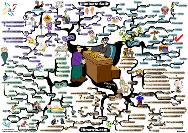 This IQ Matrix explores how to overcome the debilitating effects and emotional hold that guilt can have over your life. Guilt is another one of those covert self-sabotage forces that feeds on us from the inside-out. It has a very subtle, yet profound effect on the choices and decisions we make as we work toward the attainment of our goals. The mind map explores the consequences of guilt along with the surprising opportunities it can present us with. It breaks down a six-step process you can use to eliminate debilitating feelings of guilt. It presents you with suggestions for eradicating your feeling of guilt. More specifically, it outlines what you should avoid doing, how you must learn from guilt, and the qualities you must begin cultivating to eradicate guilt from your life. The map concludes by highlighting various things you can do to overcome your feelings of guilt.