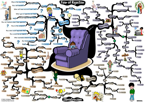 This IQ Matrix explores how to overcome the debilitating fear that prevents people from taking chances for fear that others will reject them. The fear of rejection is an indirect way we use to sabotage ourselves as we work toward our goals. Because we fear rejection we hold back from taking a chance that would move our lives forward in more optimal ways. As a result, we don't make the progress that's necessary to achieve our desired aims. The mind map identifies the consequences of indulging in this fear. It explores the evolution of the fear of rejection and how it develops over time. It highlights the various symptoms of the fear of rejection. And concludes by providing several effective solutions for overcoming the fear of rejection. This includes various questions that can help you work through this fear far more effectively. Working through this map will help you develop the necessary mindset required to overcome the fear of being rejected by others.