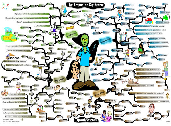 This IQ Matrix explores what it means to fall prey to the impostor syndrome and how to overcome it. The impostor syndrome is a common experience that affects high achievers. These people have achieved a high degree of success, however, they kind of feel like frauds. They feel undeserving of the success they have achieved. In their mind, they are successful because of fortunate circumstances, opportunities, and dumb luck. They believe things to be out of their direct control. In other words, their success has nothing to do with their intelligence or aptitude. As a result, they question their abilities and this keeps them from realizing their full potential. This mind map explores what the impostor syndrome is all about. It breaks down a six-step process you can use to overcome the impostor syndrome. And presents you with further guidelines and suggestions that will help you work through feelings related to the impostor syndrome. Working through this map will help you gain the self-confidence you need to feel more deserving of your success.
