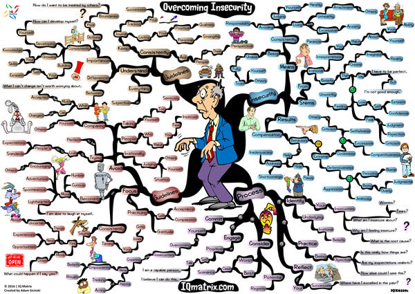 This IQ Matrix explores what it takes to move past the insecurities that hold you back from living life to the fullest. To one degree or another, everyone suffers from some form of insecurity. This is fine. The feeling only becomes problematic when our insecurities prevent us from presenting our best selves in social situations. When your insecurities consistently hold you back from making certain decisions or taking specific actions, that is when you must recognize that you're holding yourself back. More specifically, you are sabotaging your own progress. This mind map walks you through what it means to feel insecure. It breaks down a six-step process for overcoming feelings of insecurity. And it provides you with various guidelines for overcoming the insecurities that are holding you back from living your best life.