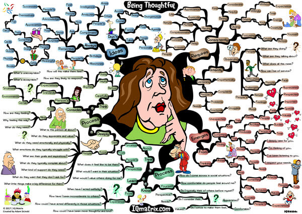This IQ Matrix explores how to be a more thoughtful person who takes other people’s needs, wants, interests, and desires into consideration. Thoughtful people often go out of their way to make other people feel appreciated, respected, important, and valued. And because they make this extra effort, they quickly form strong bonds and relationships with those around them. Subsequently, thoughtfulness becomes a wonderful act that helps you win more friends and influence people. This mind map breaks down how a thoughtful person lives their life and how they interact with others. The map also examines how thoughtfulness typically emerges through action. It walks you through a six-step process to help you get into the habit of becoming a thoughtful person. And highlights several ideas for putting thoughtfulness into action.