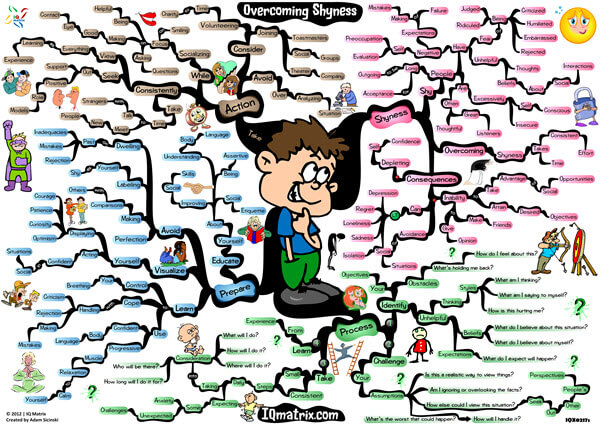 This IQ Matrix explores the steps you must take to overcome the shyness and awkwardness you feel in social situations. The mind map breaks down how shy people typically perceive the world, others, and their circumstances. It walks you through the inevitable consequences of shyness and the impact this has on your life. It outlines a four-step process you can use to overcome feelings of shyness. It breaks down how to mentally prepare yourself before stepping into social situations. And it provides you with an action plan for conquering your shyness.