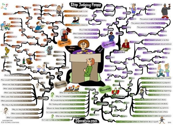 This IQ Matrix explores how to be more compassionate and accepting of people’s behavior, decisions, appearance, and actions. We all, of course, judge people to one extent or another. This is part of human nature. In fact, it’s something we do from the youngest age. However, many of these judgments are nothing more than assumptions we make about how we think people ought to be. These assumptions are based on our own personal beliefs, values, standards, and life experiences. When we judge we not only hurt the other person, we also deny ourselves the opportunity to get to know and understand them at a deep emotional level. Things may very well not be as they seem. However, unless we open ourselves to new understandings and perspectives, we will never truly free ourselves from making judgments. This map can help you develop more empathy and compassion for those around you. It explores what it means not to be judgmental. It walks you through a five-step process you can use to be less judgmental. And it examines what to do when at times you do need to make judgments