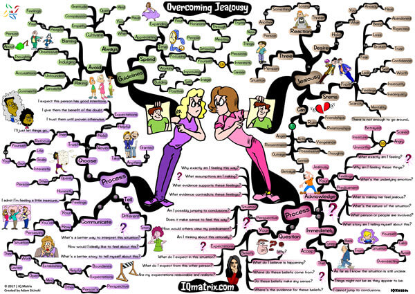 This IQ Matrix explores the steps you can take to feel more secure about yourself and about your relationship with other people. It’s important to mention here that jealousy is not the same as feeling envious. Jealousy is a three person situation, while envy is a two person situation. This mind map defines what jealousy is and provides you with a six step process you can use to ward off your jealous feelings in an optimal way. The map also presents you with additional practical tips and ideas to help you subdue your feelings of jealousy over the long haul.