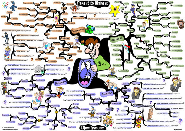 This IQ Matrix explores how to develop the self-confidence you need to overcome your fears and the awkwardness you feel in social situations. The process involves acting AS IF you already are the person you desire to be. By acting as if you're already this person you subsequently transform how you think, behave, and talk to yourself within particular social settings and situations. Moreover, this changes the choices and decisions you make and the actions you take. And as your attitude shifts, your results improve and your life takes a dramatic turn for the better. This map walks you through what it means to act as if you're already confident, successful, courageous, calm, etc. It then breaks down a four-step process you can use to begin faking it with purpose. And it concludes by presenting you with additional guidelines and suggestions for faking it like you mean it. :)