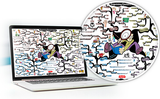Each map uses a combination of keywords, colors and images designed in an organic radial-like structure that naturally helps improve memory while encouraging photographic recall of the information you are exploring.