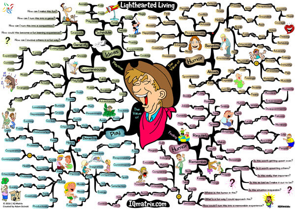 This IQ Matrix explores the value that humor, laughter, and play can bring to your life. Yes, life is full of stressors. And it can, therefore, be challenging to stay positive when it feels as though the world is conspiring against you. However, things are often not as bad as we make them out to be. In fact, we can often handle things in much more optimal ways. However, first, we need to stop taking things so seriously and inject a little humor, laughter, and play into our lives. Only in this way will we put ourselves in a prime position to make the most of our predicament. This mind map explores the value of adding a little humor into your life. It shows you how to find more humor as you go about your day. This is all about seeing things a certain way. Ultimately, it's about our perspective. The map also breaks down the value that play can bring to our lives. Play is something that can help you work through challenges in optimal ways. The map concludes by presenting you with additional ideas and suggestions for being more playful while working on tasks and while solving problems. Working through this map will help you turn problems into games and encourage you to laugh your way through personal difficulties and struggles.