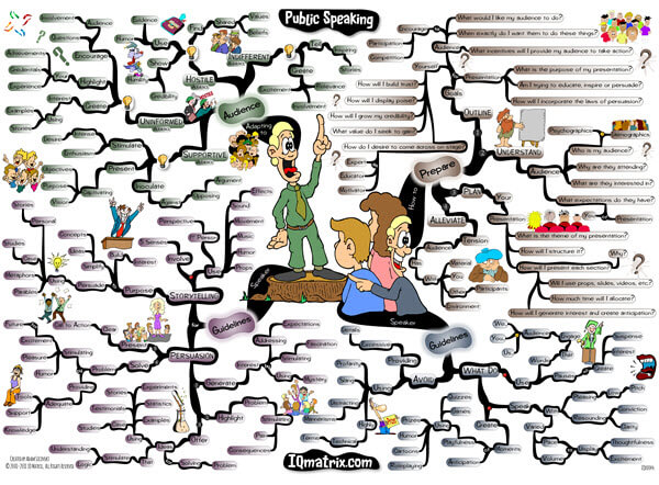 This IQ Matrix explores how to develop your skills as a professional public speaker and presenter. The mind map outlines how to prepare yourself before speaking in public. It highlights the do’s and don’ts of public speaking and presenting. Presents you with guidelines for using persuasion and storytelling in your speech or presentation. And also breaks down how to adapt your speech or presentation to the four common audience types. These audience types include the supportive, uninformed, hostile, and the indifferent audience. As you work through this map you will progressively become an influential, competent, and persuasive public speaker and presenter.