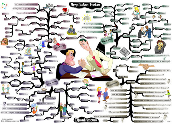 This IQ Matrix explores how to become a better negotiator in a professional as well as in a social setting. The ideas discussed in this map will help you gain a distinct advantage when negotiating deals, partnerships, prices, and contracts. Becoming a better negotiator will strengthen your career prospects and help you to better persuade others to your way of thinking. The mind map specifically breaks down the mindset of an effective negotiator. It walks you through a set of questions that help you prepare for a negotiation session. And it discusses the do’s and don’ts of successful negotiation. These are the things that will typically hinder the negotiation process.