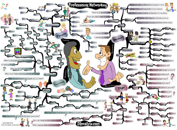 This IQ Matrix explores how to develop the mindset, know-how, and skill of a successful professional networker. The mind map provides you with the necessary information you need to develop deeper levels of rapport with the people you network with. The mind map breaks down the mindset of a professional networker. It examines how to build, grow, and sustain your professional network. Explores how to make small talk and network at business functions and events. The map also highlights the importance of tracking and recording all your interactions. As you progressively work through this map you will develop the skills and mindset required to form strong connections with key influencers to grow your business, product, service or idea.