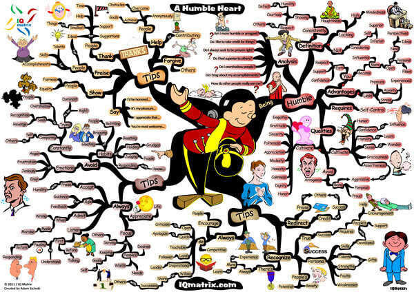 This IQ Matrix provides you with various guidelines that will help you cultivate a humble heart in all aspects of your life. The mind map defines what it means to cultivate a humble heart. It breaks down the advantages of humility and the qualities you must learn to cultivate. It presents you with a series of self-assessment questions that help you measure your level of humility. It presents you with several guidelines and suggestions for cultivating more humility in your life. And it explores the things you must do and say in social situations to live a humble life. As you work through this map you will progressively develop the necessary habits, beliefs, and behaviors of humble individuals. As a result, you will gain more honor, respect, and admiration from others, which will over time help you gain more influence over those you serve.