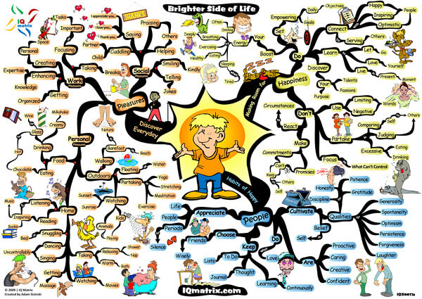 This IQ Matrix explores how to look at the brighter side of life to help you invite more happiness, enjoyment, and passion into your life. Many of us are quick to point out problems, to make excuses, and to complain when things don't pan out as expected. This ultimately hurts us as we completely ignore the good things that every situation brings to our lives. By neglecting the positive things, this keeps us closed from taking advantage of the incredible opportunities that wait for us just beyond the horizon. And sometimes, these opportunities may even lie right under our own noses. The mind map presents you with several guidelines for attracting more happiness into your life. It breaks down the indispensable habits cultivated by the happiest people in the world. And it concludes by listing down everyday pleasures that can bring more happiness, joy and satisfaction to your life.