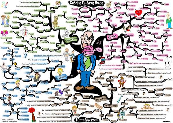This IQ Matrix explores how to tame the inner critic who continuously reminds you of your mistakes, failures, limitations, and inadequacies. If your critical voice is out of control, then it’s undoubtedly influencing every decision you make and action you take. Moreover, it’s holding you back from living your life to the best of your ability. When your critical voice is around you don’t do what you could do to achieve your goals and objectives. You, instead, hold yourself back, which only leads to a life of unfulfilled potential and endless regrets. This mind map explores where your critical voice comes from. It walks you through a three-step process you can use to subdue your critical voice. And it delves into numerous solutions for taming your inner critic. These ideas will provide you with the leverage you need to control that voice inside your head from taking control of your life.