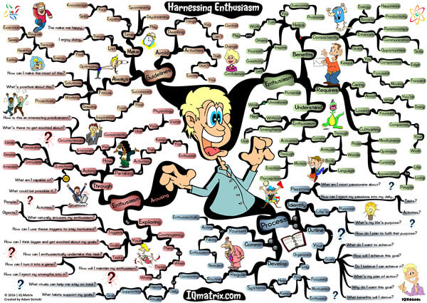 This IQ Matrix explores how to effectively use the power of enthusiasm to boost your productivity, optimize your results and achieve your goals. When we get into the habit of bringing enthusiasm to everything we do, life just becomes easier. In fact, enthusiasm is a force that will enhance your relationships, communication skills and opportunities; it will boost your energy; it will keep you focused and will make it easier to work through life’s problems. In fact, through the simple act of cultivating more enthusiasm you will live with more purpose, have more zest for life, which will naturally lead to more joy, happiness, and fulfilment. This mind map highlights the value of cultivating enthusiasm. It lists the requirements for enthusiasm. It breaks down a four-step process for harnessing more enthusiasm throughout the day. It outlines how to arouse enthusiasm using various methods. And concludes by presenting you with further ideas on how to maintain your level of enthusiasm throughout the day.